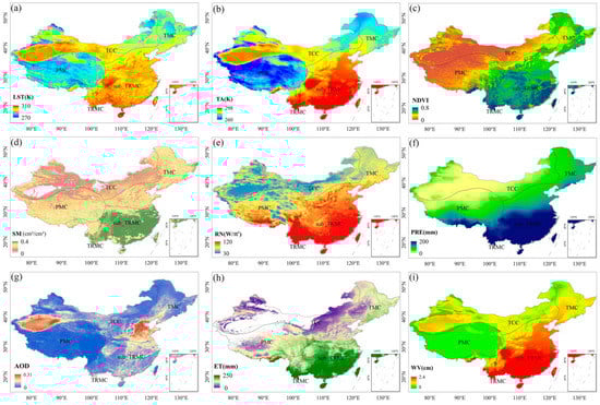 Spatial distribution of the multi-year mean of LST and eight environmental factors in China from 2003 to 2018. (a) LST (b) TA (c) NDVI (d) SM (e) RN (f) PRE (g) AOD (h) ET (i) WV. The geographical locations include temperate continental climate region (TCC), temperate monsoon climate region (TMC), plateau mountain climate region (PMC), subtropical monsoon climate region (sub_TRMC), and tropical monsoon climate region (TRMC).
