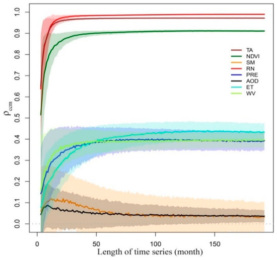 To clearly express the process of causality detection between LST and environmental factors, a pixel with grassland land cover type from the PMC region was selected as an example for a detailed demonstration. To ensure more stable results, each pair of cross-mapping processes was repeated 100 times [19], and the average of the 100 results was used as the final result. Figure 3 shows the detection results between LST and each environmental factor, with the horizontal axis being the length of the time series and the vertical axis being the ρccm between LST and environmental factors.