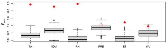 A pseudo-causal relationship between LST and environmental factors can be caused by seasonal synchronization effects. For this reason, SST tests were conducted for LST and environmental factors, except SM and AOD. The test results are shown in Figure 4, where the red circles indicate the ρccm between LST and environmental factors, and the boxes indicate the ρccm between LST and the 500 seasonal surrogate series of environmental factors. The red solid circles demonstrate that the ρccm between the LST and the environmental factor is significantly larger than the ρccm between the seasonal surrogate series and the environmental factor; that is, the causal relationship between the LST and the environmental factor is not influenced by seasonal synchronization effects. The red hollow circles indicate a pseudo-causal relationship between the LST and environmental factors caused by seasonal synchronization effects. The SST results showed a pseudo-causal relationship between PRE and LST within this pixel.