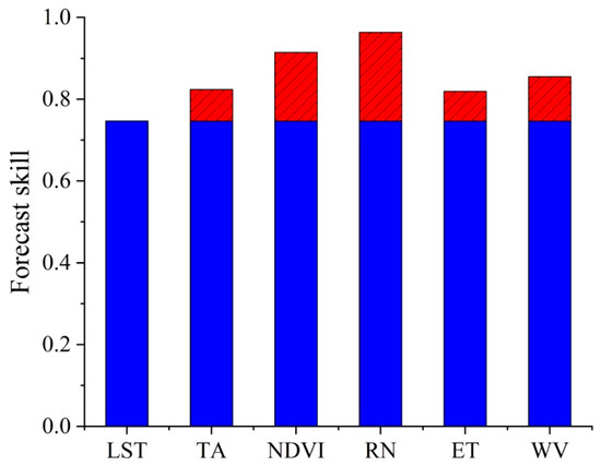 In the case of random variables, CCM and SST causality tests can be misleading because of data limitations. In this study, variables that passed the SST test were introduced into the multivariate EDM model, and this pseudo-causality was removed by examining the extent to which the variables improved the forecasting skill of the multivariate EDM model. Figure 5 shows the improvement in the forecast skill of the multivariate EDM model for LST with the addition of each environmental factor separately. The blue bars indicate the forecast skill of the multivariate EDM model for LST without the addition of environmental factors, whereas the red bars indicate the degree of improvement in the model forecast skill with the addition of environmental factors. Overall, the forecast skill of the multivariate EDM model was significantly improved by the addition of TA, NDVI, RN, ET, and WV to this pixel (p < 0.05), indicating that there was a causal relationship between the above five environmental factors and LST. RN (0.22) had the greatest improvement in the forecast skill of the model, followed by NDVI (0.17), WV (0.11), TA (0.08), and ET (0.07).