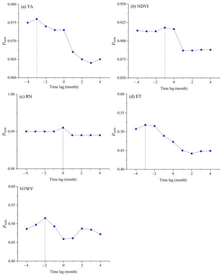 Detection of the generalized synchrony effect and the Moran effect between variables is still an indispensable step in causality detection; therefore, this study further performed the ECCM test between the LST and the five environmental factors mentioned above. The spurious driving effect of the environmental factors on LST was removed by determining the time lag length of the effect of environmental factors on LST. Figure 6 shows the results of the ECCM between the LST and each environmental factor. The time lags set in this study were four months before and after LST, and the optimal ρccm between the five environmental factors and LST were all negative. This demonstrated that the environmental factors had a real driving effect on LST and were not affected by the generalized synchronization effect or the Moran effect. The lag lengths also represented the lags in the driving effect of environmental factors on LST.