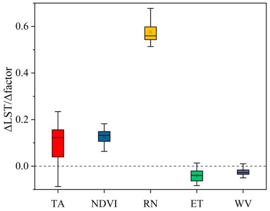 Once the drivers of LST were identified, the direction and strength of the effects of the drivers on LST were analyzed using multivariate scenario analysis. Figure 7 shows the degree of response of the LST to small changes in the five drivers within this pixel, with the horizontal axis showing the drivers and the vertical axis indicating the degree of response of the LST. The results revealed that TA, NDVI, and RN had a positive driving effect on LST; that is, LST increased as the driving factor increased. Moreover, ET and WV had a negative driving effect on LST, that is, LST decreased as the driving factor increased. In addition, RN had the strongest effect on LST with a mean value of 0.58, followed by NDVI with a mean value of 0.13. TA had a relatively weak positive driving effect on LST with a mean value of 0.10. ET and WV had weak negative effects on LST with mean values of −0.04 and −0.02, respectively.