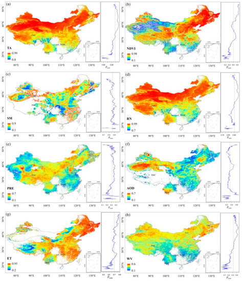 From the perspective of latitudinal distribution, the ρccm of TA increased with increasing latitude and was less than the mean value of 0.94 south of 37°N, and greater than the mean value of 0.94 between 37°N and 53°N. It saw a decline north of 53°N. The ρccm of NDVI also increased with increasing latitude, but increased rapidly between 30°N and 35°N, and then decreased between 35°N and 40°N. This may be because the region between 30–35°N is the highest altitude Qinghai-Tibet Plateau region, while 35°–40°N falls within the largest desert in China. The ρccm of the SM varied less with latitude, fluctuating around a mean value of 0.43. The ρccm of RN had similar distribution characteristics to TA with respect to latitude, with a mean value of 0.91. The ρccm of the PRE was generally lower south of 32°N and north of 53°N, as compared to the other latitudinal zones. The ρccm of AOD was significantly higher than the mean between 38°N and 43°N. This is because the main surface cover type in this region was bare ground with little rain, high dust content in the air, and increased aerosol impact on LST. The ρccm of ET gradually increased from low to high latitudes, with a mean value of 0.70. The ρccm value of WV also increased with increasing latitude, but with a smaller mean value of 0.31.