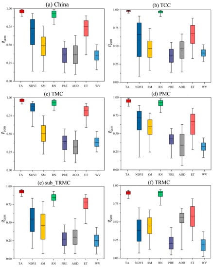 Boxplots of ρccm between LST and each environmental factor in China and each climate zone. (a) China (b) TCC region (c) TMC region (d) PMC region (e) sub_TRMC region (f) TRMC region. The upper and lower short lines represent 95% confidence intervals, the horizontal line is the median, and the square indicates mean.