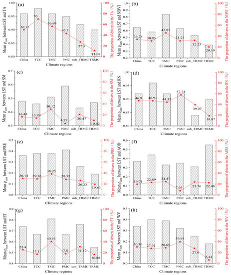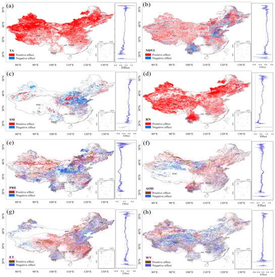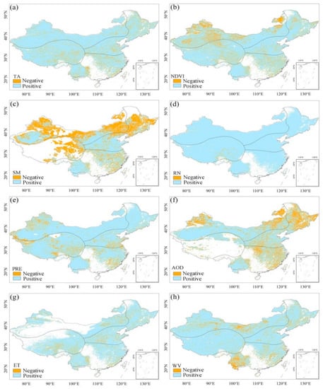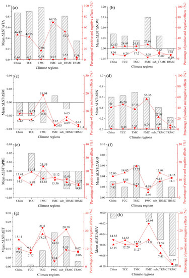 Having identified the drivers of LST over the study period, we analyzed the driving effect of the drivers. Figure 13 shows the spatial distribution of the results of the scenario analysis between each driver and LST. The red areas indicate a positive effect of the drivers on LST and the blue areas indicate a negative effect of the drivers on LST. The results revealed that there was a positive effect on LST at the national level, as shown in Figure 13a,d. A similar relationship between TA, RN, and LST was also reported in previous studies [52,53,54]. The positive effects of NDVI on LST were mostly found in the TCC and PMC regions (Figure 13b); however, both climate regions had restricted energy access. The negative effect of NDVI on LST was mostly observed in the TMC, sub_TRMC, and TRMC regions. This result reaffirmed the conclusion of Karnieli et al. [55] that the interaction between LST and NDVI is positive when energy is limited (high latitude or high altitude) and negative when energy is available [56]. In addition, the positive effect of ET on LST was mainly concentrated in the eastern part of the TCC region, most of the PMC region, and central part of the sub_TRMC region. Sun et al. [2] stated that the limits of TA and SM should be considered when analyzing the relationship between ET and LST. However, in this study, the interaction between ET and LST were related to land cover type. AOD had a predominantly positive effect on LST, whereas the regions that showed a negative effect were mainly located in the western part of the TCC region. Studies have shown that the impact of aerosols on climate depends not only on the quantity of aerosols but also on their optical properties. Aerosols affect LST by influencing the solar radiation reaching the surface. Scattering aerosols having a cooling effect as they reduce the energy received at the surface, whereas absorbing aerosols have a warming effect [55]. The large amount of dust aerosols produced in the Taklamakan Desert in northwest China increased the reflection of solar radiation from the surface, which may have been the main reason for the negative effect of AOD on LST. The positive effect of AOD on LST embodied in other regions was mainly due to the anthropogenic emissions of absorptive aerosols.
