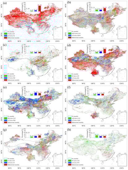 Figure 15 show the spatial distribution of the pattern of causal interaction between LST and drivers and the share of each type, respectively. Total of the three causality types between RN and LST accounted for 79.38% of the country and 20.62% had no causality (Figure 15d). Among them, bidirectional causality accounted for 48.49% and was widely distributed, while the type of LST-driven RN accounted for 20.23% and was mainly distributed in the TCC and southern part of TMC, where RN was lower. Second to RN, the areas with causality between TA and LST accounted for 78.04% of the whole country land area, while 21.96% of the areas had no causality (Figure 15a). The type of causality was mainly bidirectional, accounting for 63.36% of the country, and was mainly distributed in the TCC, TMC, and PMC regions. The causality between NDVI and LST was 34.18%, 16.31%, and 16.34% for bidirectional, LST-driven NDVI, and NDVI-driven LST, respectively, and 33.18% had no causality (Figure 15b). PRE was the only variable among the selected environmental factors that was dominated by reverse causality, that is, LST-driven PRE type causality was dominant (31.32%), and mainly in the TCC and PMC areas, which was higher than the proportion of bidirectional causality at 24.79% (Figure 15e). In addition, the WV-driven LST causality type accounted for the largest proportion of the three causality types (25.21%). For SM and AOD, no causality has a large percentage of the country, with 68.81% and 57.9%, respectively.