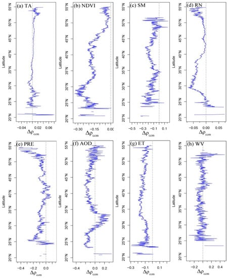 Differences between the two-way convergent cross-mapping skills of LST and each environmental factor. (a) TA (b) NDVI (c) SM (d) RN (e) PRE (f) AOD (g) ET (h) WV. Δρccm = ρccm (factor drive LST) − ρccm (LST drive factor).