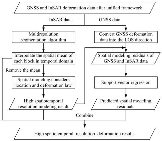 Flow chart for the fusion of global navigation satellite system (GNSS) and interferometric synthetic aperture radar (InSAR) deformation data.
