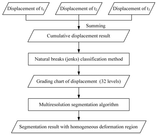 To meet the requirements of the MRS algorithm for input data and ensure that deformation data cover the entire monitoring period, we (1) selected several periods of data at equal intervals from all displacement sequences, (2) summed the selected data to obtain the cumulative displacement result, (3) classified the displacement result into 32 displacement classification maps using the Jenks natural discontinuity classification method [20], (4) input the displacement classification map into the MRS algorithm, and (5) divided the research area into multiple homogeneous objects of varying size with adjacent spatial locations and similar deformation features. The process flow is shown in Figure 2.