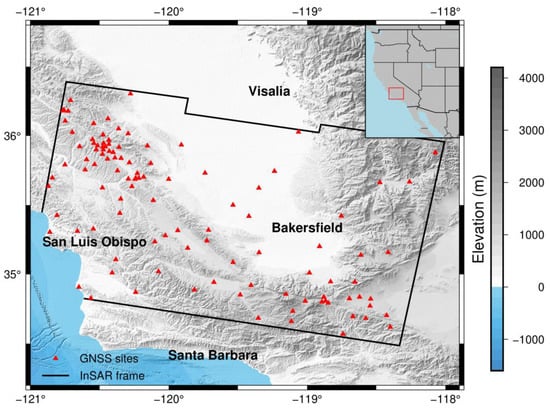 GNSS and InSAR displacement time series data for CVAS were provided by Neely, and details of data processing can be found in Neely et al. [18]. InSAR data of the Sentinel-1A/B missions cover approximately 250 km × 160 km and include 49 acquisitions from 8 November 2014 to 1 February 2017. InSAR displacement time series data are shown in Figure S1. GNSS data include daily displacement time series products from 112 continuously operating reference sites provided by the Plate Boundary Observatory [24], and they can be downloaded from ftp://data-out.unavco.org/pub/products (UNAVCO is a university-governed consortium facilitating research and education in geoscience using geodesy). Spatial distributions of GNSS and InSAR data are shown in Figure 3.
