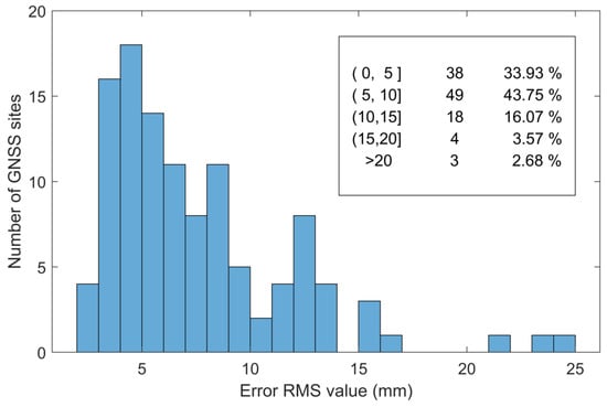 In order to evaluate the accuracy of the GInSAR processing results, after the GNSS displacement is transferred to the LOS direction of InSAR, the error RMS value between GNSS and the GInSAR result is calculated and plotted in Figure 4.