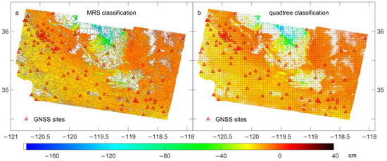Classification results corresponding to the multiresolution segmentation algorithm (a) and quadtree decomposition method (b). The grey solid line represents the boundary between different class blocks. Colors represent cumulative displacement values for three periods of interferometric synthetic aperture radar data, warm colors (i.e., positive values) indicate surface displacement towards the satellite, and cold colors (i.e., negative values) indicate motion away from the satellite. Red triangles represent locations of the global navigation satellite system sites.