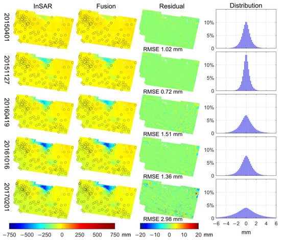 Residuals of InSAR leave-one-out validation results (Figure 6 and Figure S11) show that the spatial distribution of errors of the fusion model does not exhibit obvious spatial clustering and that most error values are below 10 mm. The numerical distribution of the error of the fusion model (fourth column of Figure 6) is close to the standard normal distribution, but the variance of different InSAR data at specific periods are quite different, suggesting that the error in the fusion model is random in the spatial and temporal domains. The error RMS value of the last InSAR data is the largest, indicating that the model error may also be related to the geophysical process, because the main deformation in this area is related to the groundwater extraction from farmland irrigation, and the cumulative deformation evolution becomes more and more complicated with time so that the fusion model cannot fully capture it. Although the validation results of the last InSAR data (1 February 2017) exhibit the highest difference from InSAR observation data and contain several locations of overestimation and underestimation, the RMSE value still remains below 3 mm because a relatively large residual is due to the lack of complementary information on InSAR deformation data from other subsequent periods. Similarly, validation results of 2 December 2014 and 26 December 2014 have higher errors owing to the lack of previous observation data.
