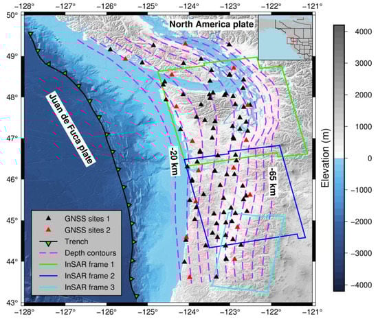 Spatial distributions of topography, global navigation satellite system (GNSS) sites, interferometric synthetic aperture radar (InSAR) data range, and depth contours of the Cascadia subduction zone. The red box in the upper right inset depicts the study area. Triangles represent GNSS site locations; black triangles represent the 97 dense GNSS sites of the first experimental scheme in Section 3.2.2 and red triangles represent the 16 sparse GNSS sites of the second and third experimental schemes. Pink dashed line indicates the location of the depth contours from −20 km to −65 km in steps of −5 km. Red, blue, and cyan solid lines represent the coverage of InSAR tracks 137 and 115 used in the experiment, with the right boundary of each frame determined by the −65 km depth contour.