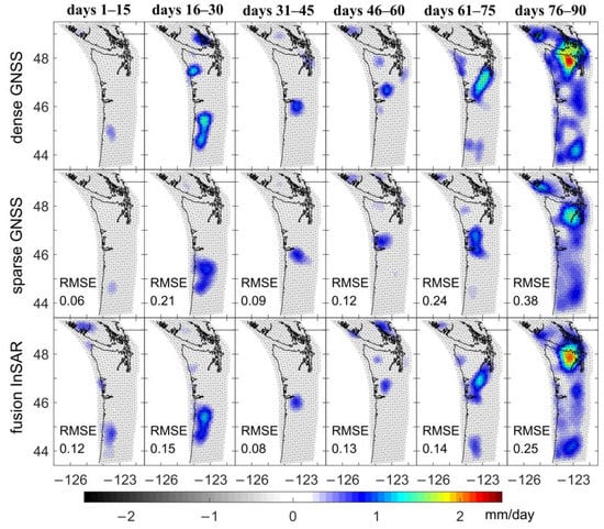 The slip rates obtained by three different experimental schemes (Figure 8 and Figure S14a–c) show that the spatial distribution and value of the slip rate obtained by fusion InSAR are closer to the results of dense GNSS than sparse GNSS. In particular, for the slip rate in the last 15 days, the results of fusion InSAR can accurately capture the aggregation of slip rate values around 48° latitude, and the RMSE value was improved by approximately 35% compared to sparse GNSS. In the first 15 days, the slip rates of sparse GNSS were closer to those of dense GNSS than those of fusion InSAR. This is because most of the slip rates in the first 15 days were close to zero, and the sparse GNSS scheme involves less data in the inversion process due to the sparse distribution of GNSS sites, and thus, the results of the inversion were relatively close to zero. Because the simulated InSAR data contained white noise, the fusion InSAR results tended to have smaller slip rates in the western part of the research area, which eventually led to large discrepancies with the dense GNSS results.