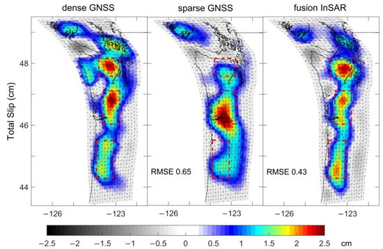 A comparison of the total slip obtained by sparse GNSS (the second column of Figure 9) and fusion InSAR (the third column of Figure 9) with the results of dense GNSS (the first column of Figure 9) shows that the results of fusion InSAR are closer to dense GNSS in the spatial distribution pattern and magnitude than that of the sparse GNSS. Additionally, fusion InSAR better reflects detailed information on the spatial distribution and numerical changes of total slip from north to south. This is particularly evident for the three apparent numerical aggregates in Figure 9 (red dashed rectangles) with a total slip amount of more than 1.5 cm. Results of fusion InSAR can achieve a substantially accurate spatial distribution description and detailed information, but the sparse GNSS scheme apparently missed this part of the information. Relative to the dense GNSS, the fusion InSAR scheme had an RMSE value that was 30% less than that of the sparse GNSS scheme.