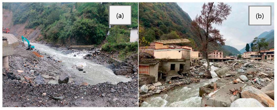 Flash flood on 20 August 2019 in Aba Prefecture, Sichuan. (a) The bridges were broken; (b) the houses were destroyed (photo taken by author).