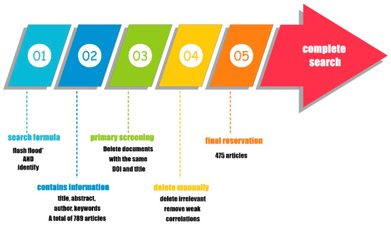 Papers were retrieved on 2 May 2022. The time span was set from “unlimited” to 2022, and a total of 31 years (from 1991 to 2022) of documents published were retrieved. The retrieval strategy is shown in Figure 2. The core search terms were “flash flood*” and “identify”. The term “flash flood*” means similar terms such as “flash flood”, “flash floods”, “flash flooding”, etc. The term used in the search here is ”identify”. These articles were mainly included in the core collection of the science network Web of Science. A total of 789 documents were retrieved, and the retrieval was carried out in one day to avoid changes caused by daily database update. According to the uniqueness of document DOI and title, 700 documents were saved in the Web of Science by using the duplicate checking function of Office software Excel to delete duplicated data and extended duplicated items of DOI and title. The search results are rich, and there are inevitably some weakly related content that needs to be further screened in the future. In order to ensure the representativeness of literature data and the reliability of meta-analysis and visual analysis, we first defined the research field as “early identification of flash floods”, and established specific inclusion and exclusion criteria for the selection of papers through repeated discussions in four meetings, as shown in Table 1. Then, the Excel table of the literature record information downloaded from the WOS database was used to identify each item, and the screening range included the title, abstract, and keywords of the paper. Recognizing that flash floods mainly occur in mountains and cities, the study area of this paper excludes glaciers, deserts, and coastal areas. Papers on flash floods caused by rainfall were kept, but papers on flash floods caused by glacier lake dam break, glacier melt, dam break flood, and tsunami were excluded. We chose to focus only on the five subfields of early identification of precipitation, sediment, sensitivity analysis, risk assessment, and uncertainty analysis in flash floods, and excluded papers on trace elements, child feeding, isotopes, crop growth, molecular genetics, and computer servers. Proceedings papers, early access, editorial materials, and meeting abstracts were excluded. Articles, review articles, and letters were retained so that our research efforts could focus on papers published in peer-reviewed or editorially supervised publications.