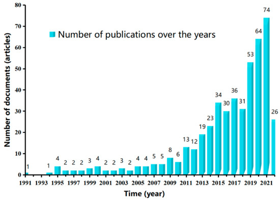 - 2014–2021 is a stage of rapid development: With the rapid progress of information technology, network technology, and computer hardware, the early identification technology of flash flood disasters had developed rapidly, showing a vigorous development trend, and the number of documents published was increasing. The number of documents published in 2021 was 74, reaching a phased peak. It was expected that the trend of a high number of documents published would continue in 2022.