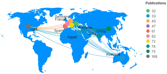 In terms of the number of documents published by countries (regions), scholars from 100 countries (regions) have published papers related to the early identification technology of flash flood disasters. The spatial distribution of the number of documents published is the macroscopic expression of national or regional research forces, which can reflect the regional differences in a certain field and the situation of academic exchanges and cooperation. Figure 4 shows that scholars are distributed in different countries (continents). Although the number of studies varies greatly, it can reflect that the field of flash floods has been widely studied by researchers in different countries (continents) to a certain extent. The United States had carried out the most research in this field (175 documents), followed by India (77 documents), and then Italy [61,62,63,64,65,66,67] (71 documents). China ranked fourth (70 documents), and France ranked fifth, with 64 published documents. The top five countries accounted for 56.70% of the total number of documents published, indicating that the research pattern of early identification of flash flood disasters takes the United States, India, Italy, China and France as the core, other developed countries (continents) as the priority, and developing countries as the supplement. Three of these countries are considered developed countries (the United States, Italy, and France), which means that the advantages of these countries in terms of science and technology, infrastructure, and economic development levels have provided important contributions to the development of this field.