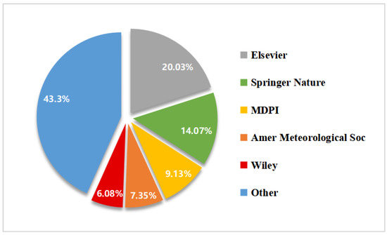 Influence of the publishers: The papers retrieved in this study have been published by as many as 131 publishers, of which 49 publishers have published two or more papers on the identification of flash flood disasters. Elsevier published the largest number of papers (totaling 158), and became the most influential publisher in this field; Springer Nature ranked second due to 111 published papers in total; MDPI ranked third and published a total of 72 papers. Figure 6 shows that the number of papers published by the top three publishers accounted for 56.66%, indicating that the papers on the early identification technology of flash flood disasters were relatively concentrated, and mainly published by the three most influential publishers in this field.