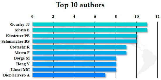 Influence of the authors: A total of 2830 authors have published papers in this field. As shown in Figure 7, the authors publishing the largest number of papers are Gourley and Morin, who tied for first place with 11 papers. Gourley et al. were committed to the research of hydrology and meteorology, and their five documents were published in the Journal of Hydrology. Their contributions in this field were mainly reflected in: (1) carrying out statistics and analysis of human impact by using a flash flood event database and introducing physical parameters [89]; (2) measuring the severity of flash floods by introducing a new variable called “flashiness“ [90]; (3) proposing a new method [91] to collect near real-time high-resolution observation data on environmental conditions and disastrous consequences, and improving the accuracy of predicting the temporal and spatial changes in flash flood disasters by evaluating the radar-based prediction tools. Morin et al. focused on the research of hydrology and geosciences, aiming to determine the significant differences of three weather systems (namely, Mediterranean cyclone (MC), active red sea trough (ARST), and subtropical jet stream (STJ)) that can trigger flash floods in hydrometeorology [92]. They also proposed to replace the lower threshold of secondary flow in transient alluvial rivers in arid environments with an initial geomorphic index of flash floods in an alluvial river (AFIG) [93], so as to reliably estimate flash floods and establish a flash flood early warning system. The authors with the second largest number of published papers are Kirstetter and Schumacher [89], who had extensive cooperation and also carried out research in hydrology and meteorology. Schumacher et al. mainly researched atmospheric science and hydrometeorology, and he proposed a conceptual model of extreme rainfall processes near the middle atmospheric circulation [94].