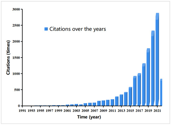 This paper analyzes and explains the number of articles published over the years using document management software Endnote X9, statistical software Excel, and mapping software Origin 2018. As shown in Figure 3, in terms of the overall time trend of publishing documents (1991–2022), the number of documents published shows an exponential growth trend, indicating that the research in the field of early identification of flash flood disasters has attracted more and more attention from international scholars. It can be seen from the number of documents published in each year that the research in this field has mainly experienced three stages.