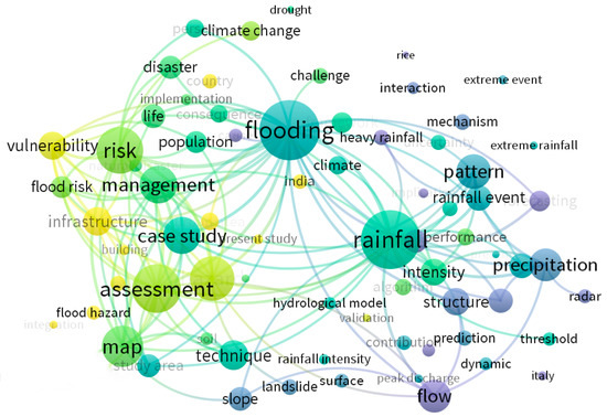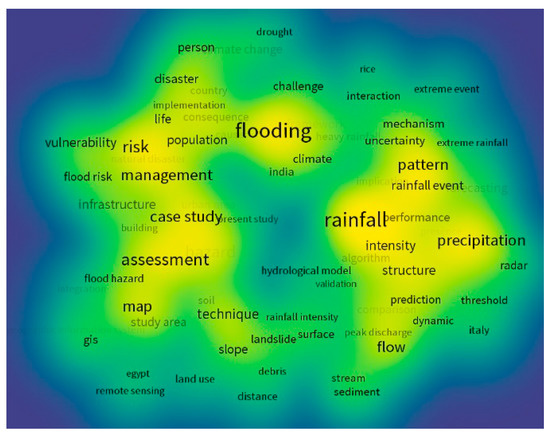 As a characteristic function of VOSviewer, the visualization method of a density map uses the total frequency or total co-occurrence frequency of nodes to measure the weight of nodes, so as to intuitively reflect the frequency density of co-occurrence between high-frequency words [54]. The basic principle is that the keyword density mainly depends on the number of knowledge units around a knowledge unit and the weight of these knowledge units. The more surrounding nodes there are, the shorter the distance between these nodes is, and the higher the density will be. The greater the weight of the node is, the higher the density is. In order to find the research focus and hotspots in the field of early identification of flash flood disaster more intuitively, we further draw the keyword co-occurrence density view, as shown in Figure 11. Blue and yellow in the figure are used to represent the density near a subject, and each node displays different colors according to its density. The more concentrated the nodes near another node are, the greater its weight is, and the closer its color to yellow will be; otherwise, its color will be closer to blue. Taking “map” as the center, three important research areas have been formed, and other research areas such as “warning” have also received high attention. These main keywords have been taken as the center to form some related research hotspots, which has constituted the basic research pattern in the field of early identification of flash flood disasters.