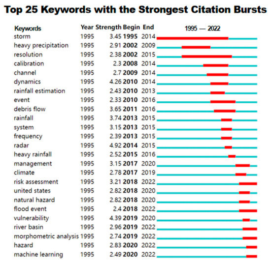 Figure 10 shows the start and end years and the emergence intensity of keywords in the field of early identification of 25 flash flood disasters. From 1995 to 2001, no new words appeared except for the mutation keyword of “storm”, which is consistent with the small number of documents published in this period, shown in Figure 3. After the research on the early identification technology of flash flood disaster entered the development stage, the mutation word “heavy precipitation” began to appear in 2002, which was also an earlier research content, with a longest duration of 7 years and a larger intensity of 2.91; “resolution” appeared in the same period and lasted longer (13 years), but its mutation intensity was weaker than that of “heavy precipitation” (2.38 < 2.91); in less than eight years from 2014 to 2022, a total of 22 mutation keywords appeared successively, which also proved that the division method of judging whether the research in this field has entered the stage of rapid development through the number of documents published is appropriate. The new mutation words such as “dynamic”, “debris flow”, and “rainfall” appearing successively in this stage indicated that the new research content in the field of early identification of flash flood disaster was developing in a diversified direction. In particular, the contents that were still continuously researched as of May 2022, such as “risk assessment”, “morphometric analysis”, and “machine learning”, were also the research focus at present and in the future, and would be undoubtedly hotspot issues worthy of attention and in-depth research in the field of early identification of flash flood disasters.