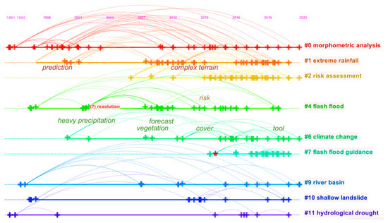 To further analyze the future research trend in the field of early identification of flash flood disasters, another function of CiteSpace software called “TimeLine” mode [55,56,57,58] can be used to run the documents from 1994–2022. The analysis of the core words co-citation timeline is shown in Figure 13. The clusters unrelated to this research are hidden, but only seven clusters with strong correlation are retained. The horizontal axis is the time span, while the vertical axis is the cluster partition. Each node represents different keywords. This figure can explain the evolution law of keywords on the timeline well. The size of the arc span in the figure represents the span time of its keywords.