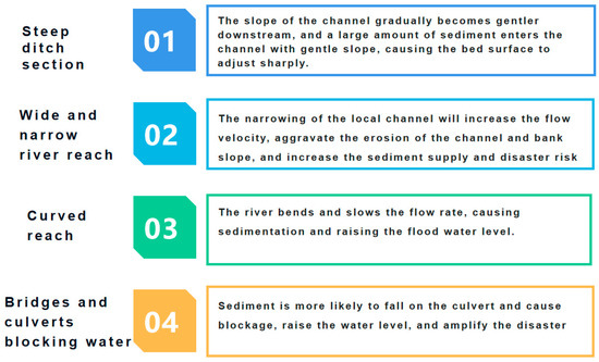 A large number of flash flood disaster events showed that large flash floods would cause major disasters, and small flash floods would also cause major disasters under the influence of sediment [47]. After experiencing many flash flood disaster events, people found that due to the rapid changes in flash floods, the coupling of flash flood and sediment movement in mountainous areas would lead to severe disasters. The coupling effect of sediment and flash flood was often the key factor that led to major flash flood disasters, which often led to disastrous consequences of “small flash flood and large disaster”. Heavy rainfall triggered many collapses and landslides, and a large number of low-viscosity loose clastic sediments were suspended in steep bank slopes and ditches, providing sufficient material sources for flash flood disasters. The flood and sediment disaster was mostly manifested as a complete chained disaster process of “rainstorm–flash flood–surge in sediment supply–gully bed response–water level rise–disaster”. The flood disaster and sediment disaster were often interwoven to form flash flood and sediment disaster, which was mainly manifested in the cumulative erosion and deposition at inappropriate locations caused by the change in sediment transport law. The easily silted river reach is shown in Figure 15.