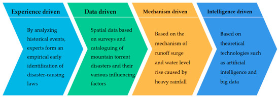 The distribution of flash flood disasters in time and space is uneven [32], which is mainly manifested as different group occurrences of flash flood disasters and different combinations of flash flood disaster types in different regions, which shows the characteristics of regional differentiation; the uneven distribution of the flash flood disasters in time is mainly manifested as the sudden occurrence of disasters. In addition, as flash flood disasters have problems of fast occurrence [33], great difficulty in monitoring [34], and lack of data [35], it is very difficult to accurately identify the location and time of flash floods [36]. With the continuous development of monitoring sensors [37,38,39] and computer technology [40,41], various early identification technologies [42] are more and more widely applied to the research of flash flood disasters. Flash floods are caused by a number of factors, including climate change, population growth, and urban development. These factors all contribute to a reduction in the amount of land that is impervious to water, which in turn leads to an increase in the volume of runoff. In light of this, a large number of researchers looked into how changes in land use and land cover (LULC) may be contributing to an increase in the number of instances of flash flooding. Of course, they used remote sensing technology to identify prone areas (The Impact of Spatiotemporal Changes in Land Development (1984–2019) on the Increase in the Runoff Coefficient in Erbil, Kurdistan Region of Iraq) [43]. As an important part of early warning systems (EWSs) [44], early identification technology has gradually developed into a favorable tool to identify high-risk areas and predict hydrological conditions, so as to minimize the loss caused by flash flood disasters. Therefore, many countries and regions threatened by flash flood disasters pay more and more attention to the research on the early identification technology of flash flood disasters.