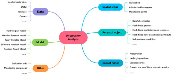 Sensitivity analysis is an important means of risk identification and management for flash flood disasters [107]. Flash flood sensitivity mapping has been regarded as the basic stage of flash flood early identification and risk reduction. As many influencing factors are involved, it is easy to misjudge the flash flood disaster by using a single sensitivity analysis method. To date, there has been no method that can be applied to the flash flood sensitivity analysis and mapping in all regions, and the specific selection of analysis methods is often determined by many factors, such as the data type, research object, and research area. At present, there are various sensitivity analysis methods (as shown in Figure 16), which can be generally divided into four categories: experience driven, data driven, mechanism driven, and intelligence driven.