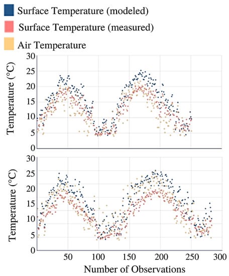 Scatter plot of the temporal variation of the modeled surface temperature, measured surface temperature and air temperature. The upper and lower plots represent temperature values corresponding to the AM and PM overpasses, respectively.