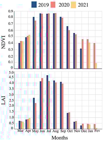 Figure 3 presents information about vegetation density and vitality at the Millbrook site during the experiment period. NDVI values revealed a significant seasonal change in the vegetation corresponding to an increase during the spring leaf development season and further maturation of the canopy, and correspondingly, a decrease during the autumn senescence season was observed. For instance, NDVI values peaked between the months of May and September within a range of 0.75 to 0.86. NDVI values declined throughout October and November due to leaf abscission, reaching their lowest values during January–February when all leaves had fallen from deciduous trees and were completely absent in the considered area (Figure 3). Similarly, LAI peaked during the months of June–September and dramatically declined during the months of October and November. In spring and summer, the LAI increased significantly, reached its peak value (greater than 4) in mid-summer, and then gradually decreased in autumn (Figure 3). In autumn, the canopy decreased, reflecting the trajectories of leaf abscission. Overall, LAI and NDVI exhibit the seasonal cycle of the tree phenology, but the relative magnitude of the cycle is larger for LAI, and its autumn decrease is steeper and occurs earlier than that of NDVI.
