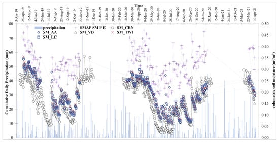 A comparison of the time series of upscaled soil moisture and soil moisture measured by the USCRN permanent station with the soil moisture obtained from the SMAP 33-km pixel. Precipitation records from the USCRN station are also presented. The following time series are illustrated in this figure: SMAP AM overpass observations (SMAP SM PE), soil moisture from USCRN station (SM_CRN), and upscaled soil moisture based on arithmetic average (SM_AA), Voronoi diagram (SM_VD), topographic wetness index (SM_TWI)-, and land cover-based (SM_LC) weighted average.