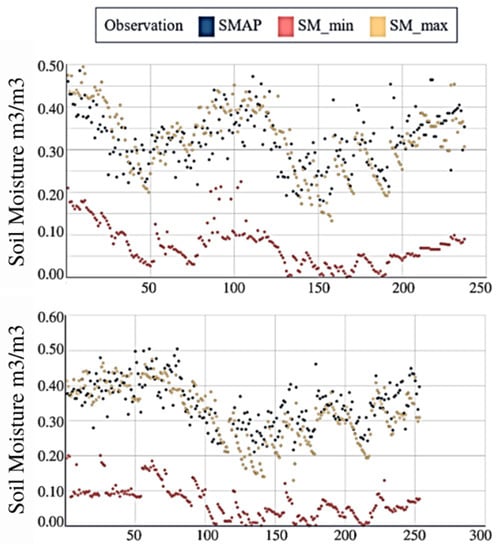 Figure 5 presents the SMAP AM/PM observations, the minimum and the maximum recorded soil moisture values from the site stations for the considered time steps. It is important to mention that approximately 90% of the maximum recorded soil moisture was obtained from a station located at the center of the grid cell where the deciduous forest land cover is dominant. The measured soil moisture values and the SMAP retrievals have the same patterns. The SMAP values are systematically close to the maximum recorded soil moisture from the site stations. This finding is valid for both the ascending and descending overpass observations.