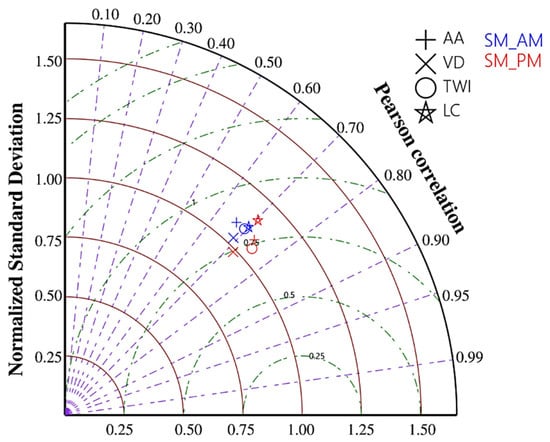 Taylor diagram comparing SMAP L2SMP_E AM/PM observations with soil moisture series derived from the upscaling techniques based on the Arithmetic Average (AA), Voronoi Diagram (VD), Topographic Wetness Index (T), and Land Cover (LC).