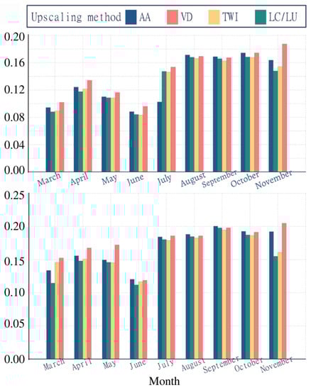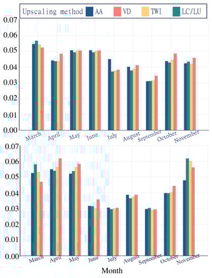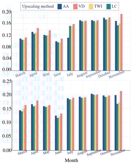 RMSD values (Figure 9) indicate that L2SMP_E performance is not stable and exhibits substantial variability throughout the various months of the year. In July, August, September, and October, we observed high RMSD values, ranging from 0.112 to 0.181 m3.m−3 and 0.181 to 0.202 m3.m−3 for the AM and PM overpasses, respectively. In July–October, there were no significant differences between the RMSD values obtained from the various upscaling methods. The L2SMP_E data is generally better from March through June, with the lowest RMSD values obtained during June. According to the results of the different upscaling methods for the AM and PM overpasses, the average RMSD value for June was 0.10 m3.m−3 and 0.16 m3.m−3, respectively. Overall, RMSD values were high during the summer season and gradually decreased during early spring. It is essential to mention that the different upscaling approaches exhibited similar RMSD patterns.