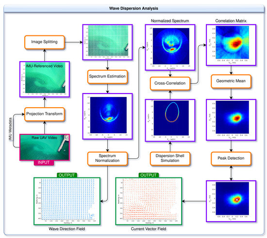 The video records were processed using wave dispersion analysis (WDA) widely applied for SCC and bathymetry estimation from ocean surface wave images [25,27,41]. The feature of the present WDA implementation is the optimized dispersion shell recognition aimed at discarding false spectral peaks caused primarily by the non-linearity of the wave imaging mechanism [29].