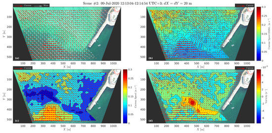 Scene #2: (a) sea surface current (SSC) and wave quiver maps; (b) SSC root-mean-square error (RMSE); (c) SSC speed; and (d) SSC vorticity.