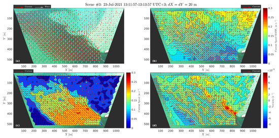 Figure 3. Scene #1: (a) sea surface current (SSC) and wave quiver maps; (b) SSC root-mean-square error (RMSE); (c) SSC speed; and (d) SSC vorticity. - 8.