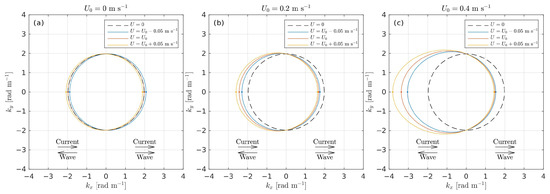 Wave dispersion curves illustrating sea surface current (SSC) reconstruction error at different SSC magnitudes: (a) m s; (b) m s; and (c) m s. The SSC, directed along the positive x-axis, is varied within ±0.05 m s range. The waves with () are aligned with (opposite to) the SSC. The wave frequency is fixed at Hz.