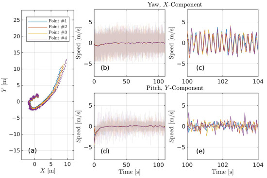 UAV self-stabilization quality control test from land control point tracing: (a) apparent drift of the control points; (b,d) X- and Y-projection of control point velocity (gray lines—frame-by-frame estimate, color lines—4-s time average); and (c,e) velocity fragment showing its high-frequency structure.