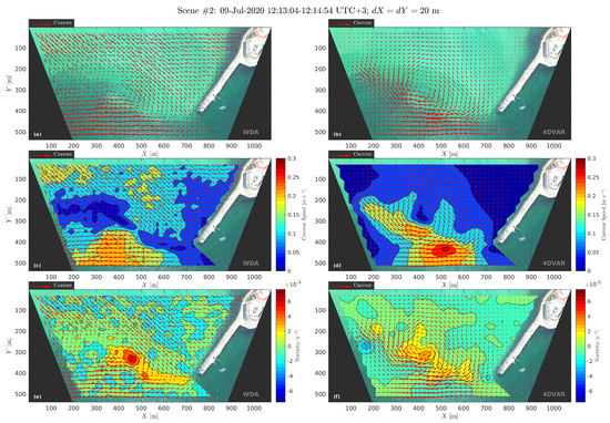 Sea surface current (SSC) maps for Scene #2 estimated using wave dispersion analysis (WDA) and 4D-variational assimilation (4DVAR): (a,d) SSC quiver map; (b,e) SSC magnitude; and (c,f) SSC vorticity.