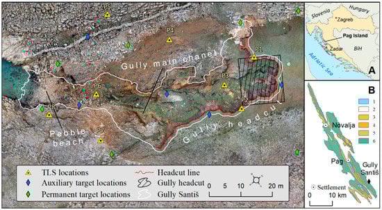 Study area covering complex morphology of gully Santiš ((A)—location of Pag Island within Croatia; (B)—location of gully Santiš within geological map of Pag Island (1—Water; 2—Holocen deposits; 3—Limestone breccia; 4—Flysch; 5—Foraminiferal limestones; 6—Rudist limestones)).