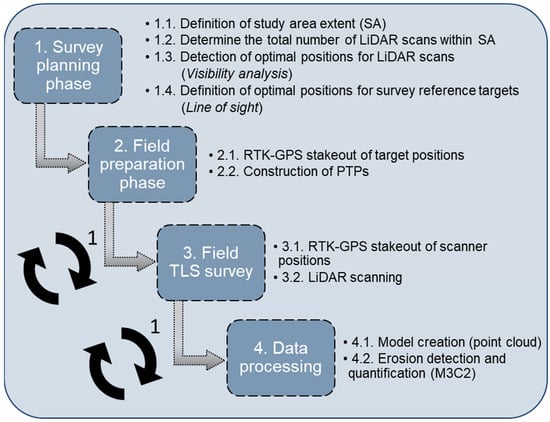 The developed methodology for systematic optimization of multi-temporal TLS surveys can be divided into following four main phases: (1) survey planning, (2) filed preparation, (3) multi-temporal field TLS surveys and (4) data processing (Figure 2).