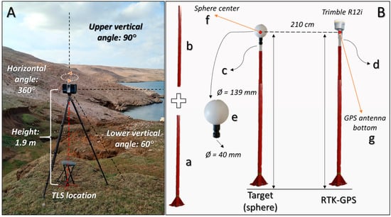 Faro Focus M70 terrestrial laser scanner used for multi-temporal point cloud acquisition (A); Design of metal poles for mounting of permanent survey targets (spheres) to the preferred height (B) (a & b—metal poles; c—adapter for sphere; d—adapter for RTK-GPS antenna; e—standard sphere; f—sphere center; g—RTK-GPS antenna bottom).