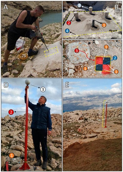 Methodology applied for preparation of seven PTPs distributed around the gully Santiš ((A)—carving of PMPs in carbonate badrock with hammer drill; (B)—leveling of PMPs with self-leveling concrete (B①—anchors drilled in concrete; B② and B③—plastic cover of metal anchors for preventing corrosion; B④—leveled base of metal poles); (C)—plaster cap created for long-term protection of PTPs (C①—metal anchors; C②—whole for measurement with RTK-GPS; C③—gypsum protective cap); (D)—installation of target (sphere) on metal pole fixed to the PTP (D①—target (sphere); D②—designed metal pole; D③—PTP); (E)—example of permanent target fixed at the height of 210 cm above planned PTP).