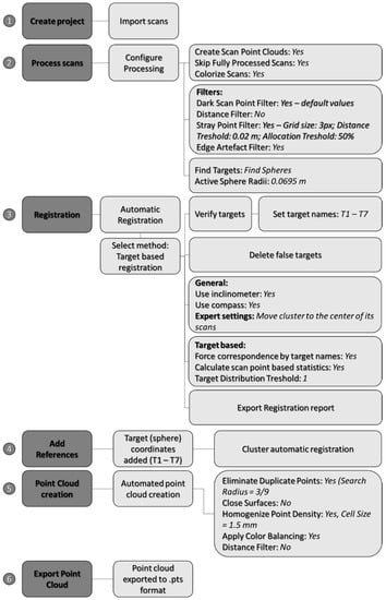 The last phase of the developed framework covers data processing and model creation (4.1.) and detection of STCs (4.2.). The identical methodology for processing of collected LiDAR scans and creation of VHR models was used for data collected by both TLS surveys. A detailed graphical representation of the whole data processing and VHR model creation is given in Figure 6.